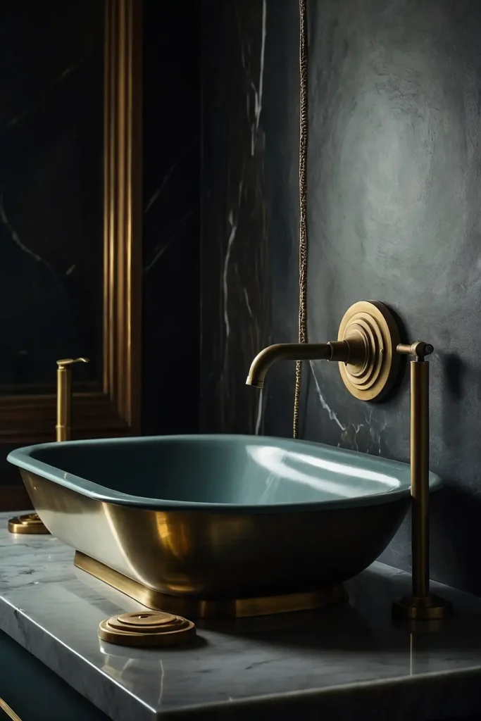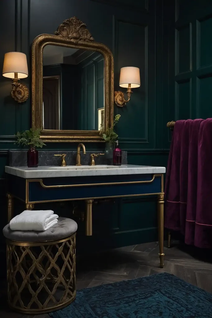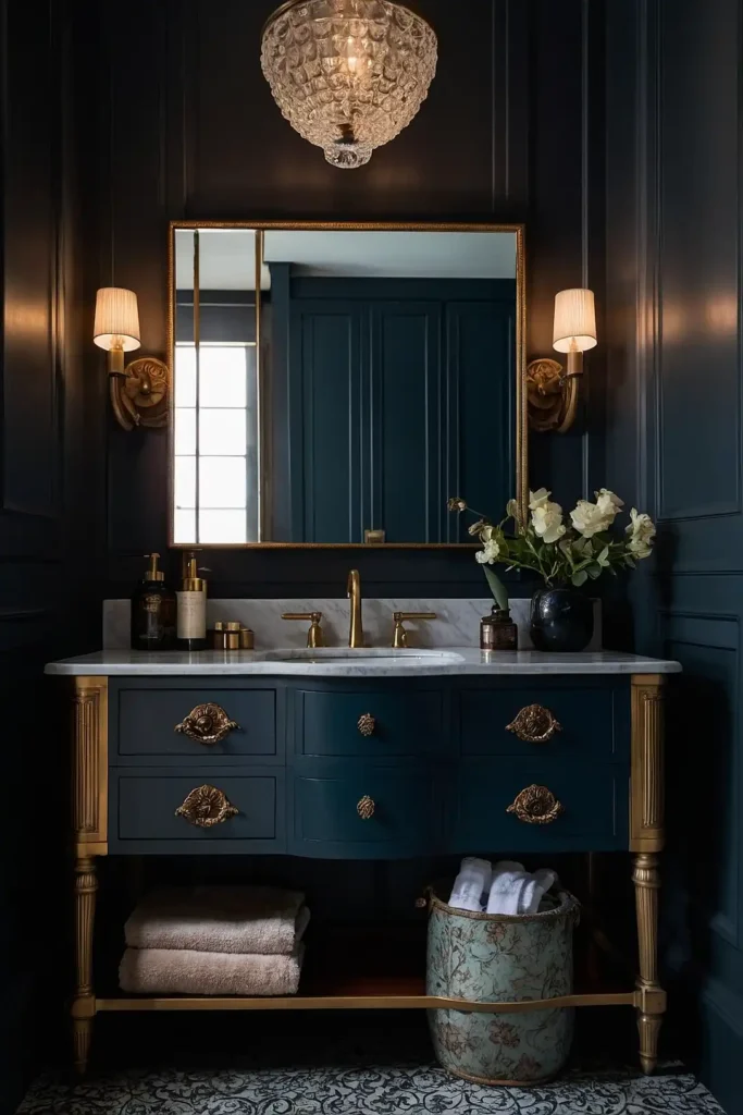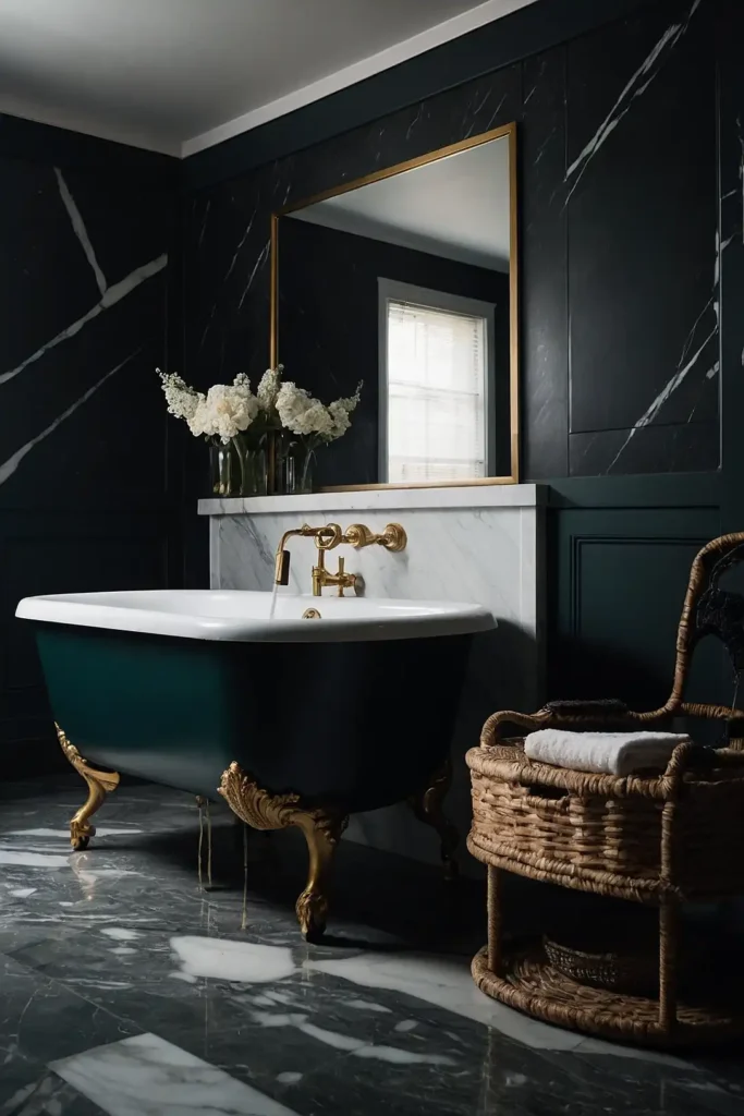 You can balance darkness with metallic accents and warm lighting. Dark walls make white fixtures and marble surfaces appear more dramatic and elegant.