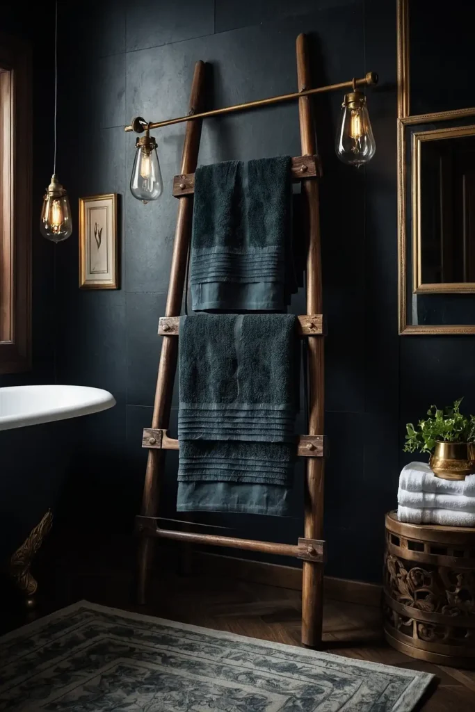 Repurpose vintage wooden ladders as towel storage and display solutions. You can lean ladders against walls or mount them permanently.