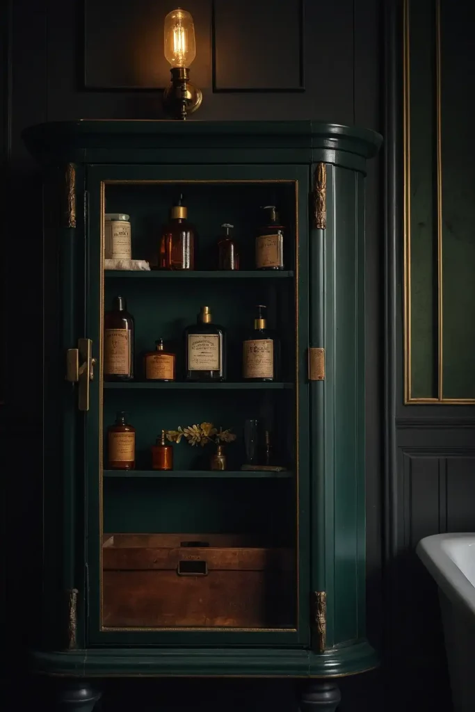 These pieces provide hidden organization while maintaining period-appropriate bathroom functionality.