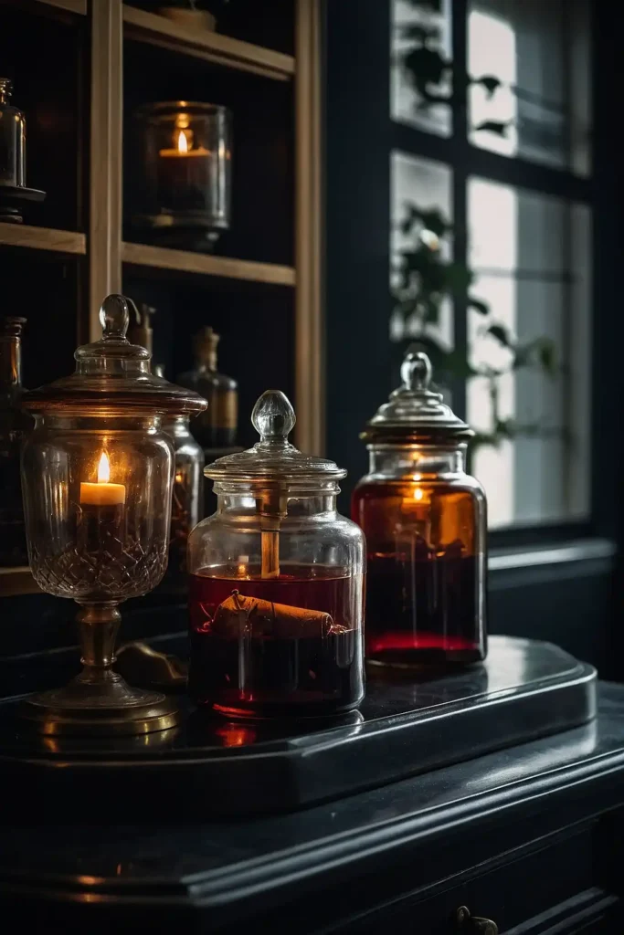 Your storage becomes decorative elements that enhance the vintage apothecary aesthetic beautifully.