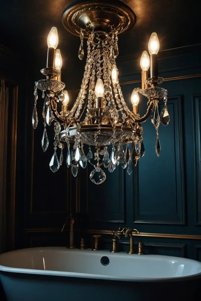 Install a vintage crystal chandelier for glamorous bathroom lighting that surprises guests.