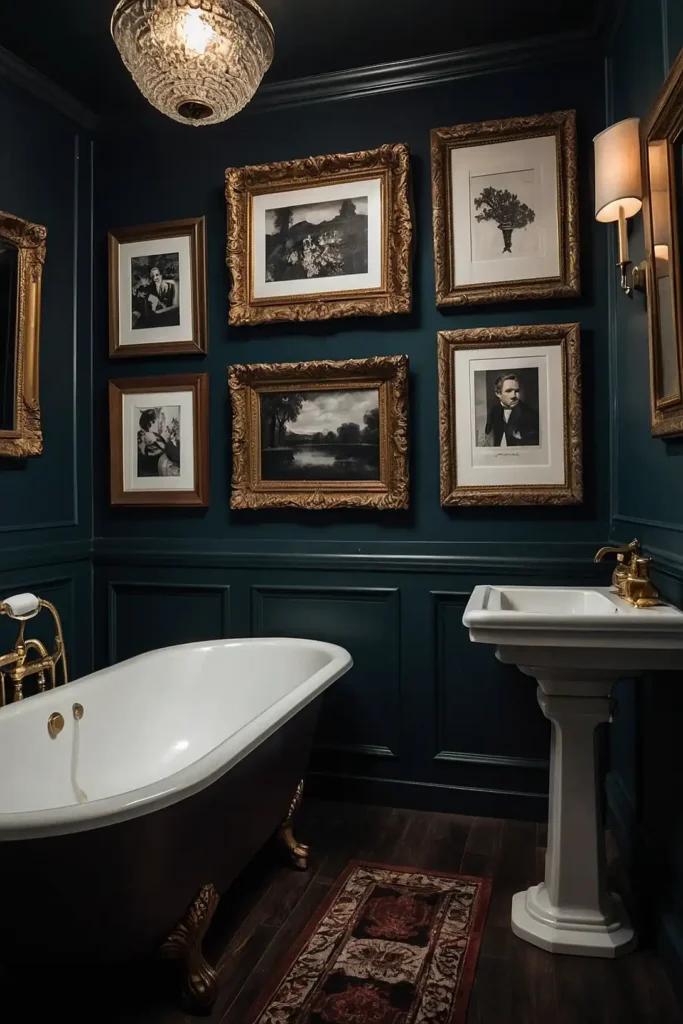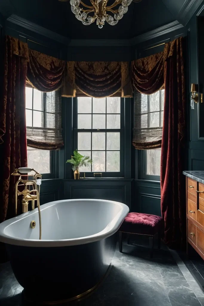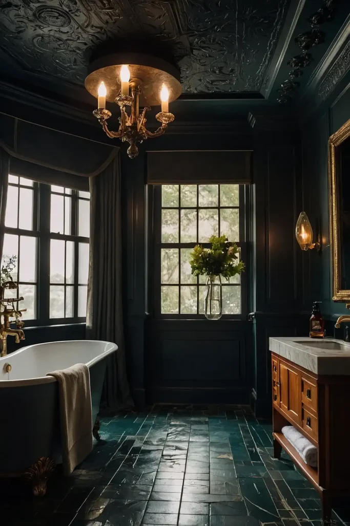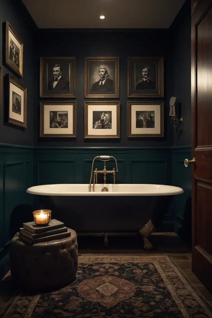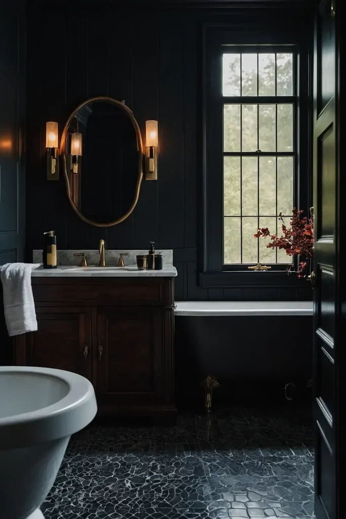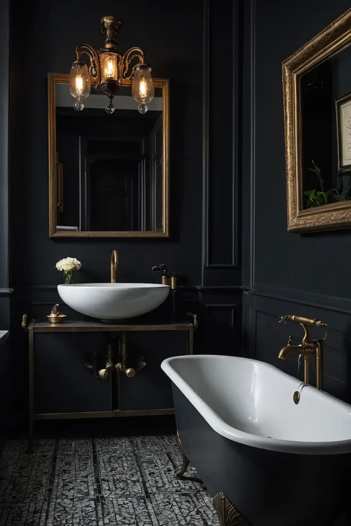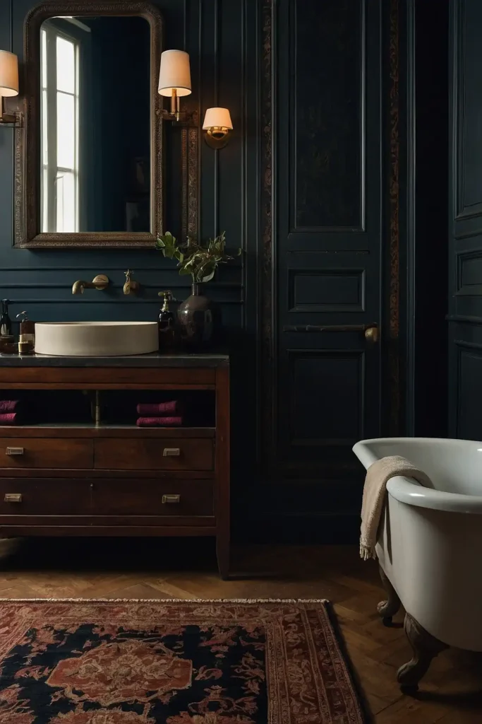Your bathroom achieves sophisticated drama through bold color choices that enhance vintage elements.