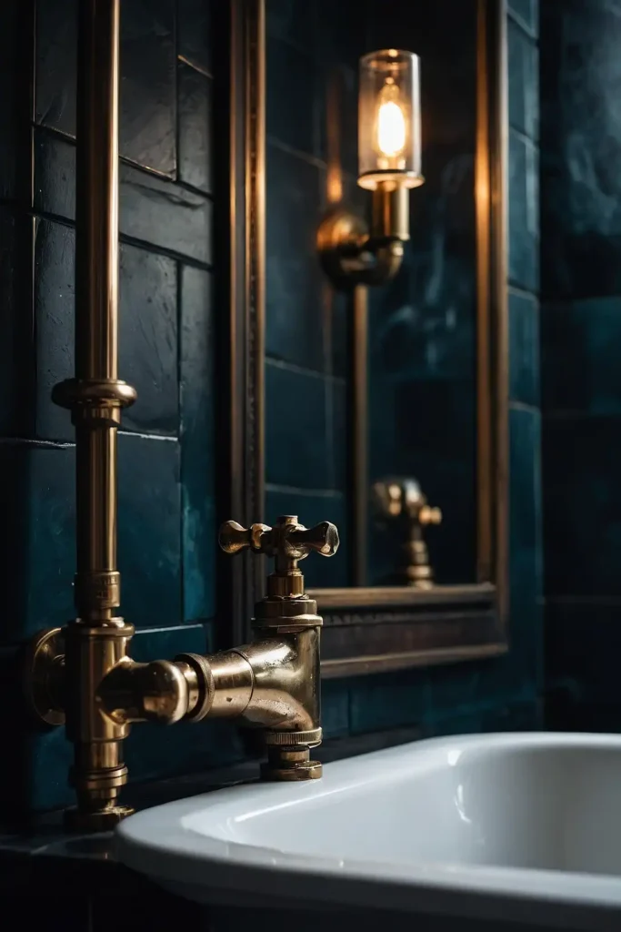 Exposed brass or copper pipes add industrial charm while maintaining period authenticity.