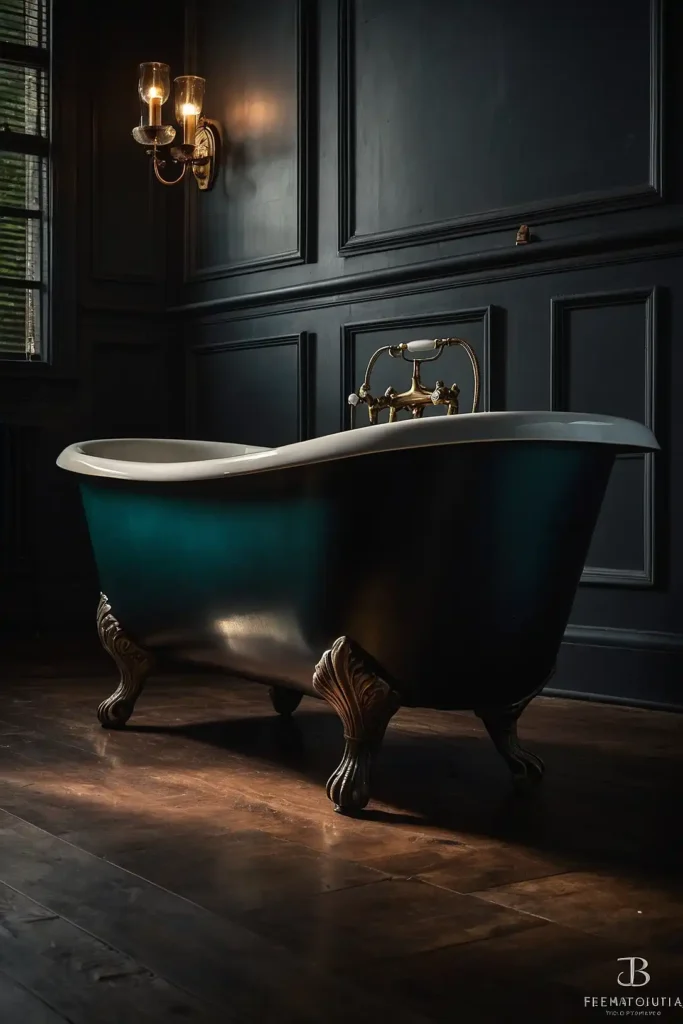 Paint walls in rich charcoal or deep gray for sophisticated moody ambiance. Dark colors create intimate spa-like atmospheres while highlighting vintage fixtures beautifully.