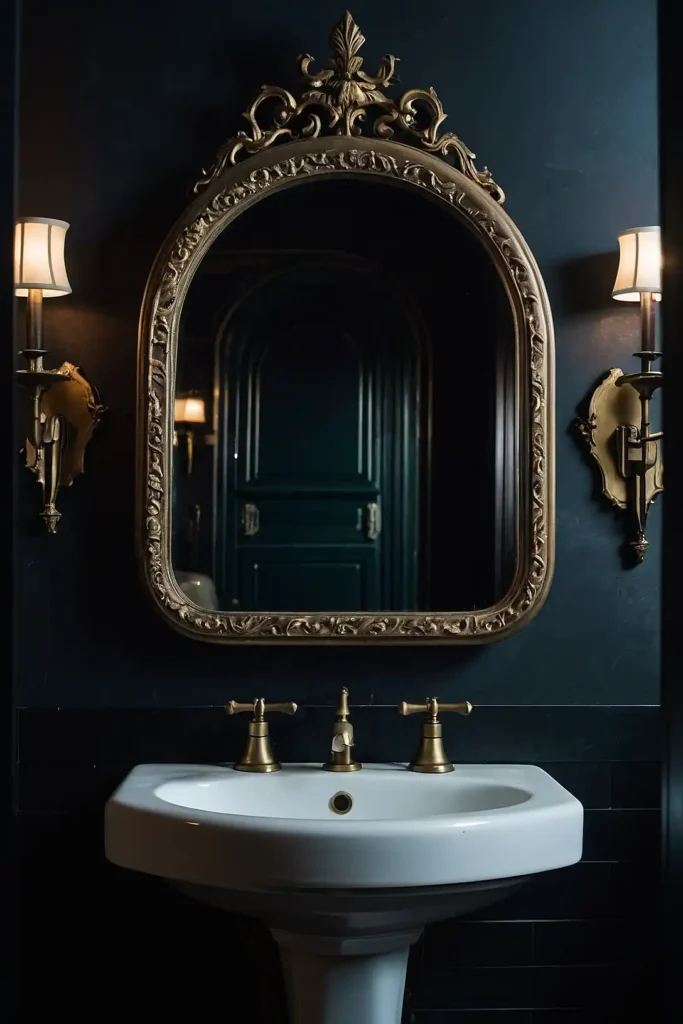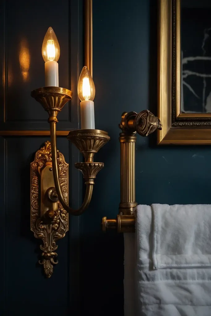 Install period-appropriate brass wall sconces for warm, atmospheric lighting around mirrors.
