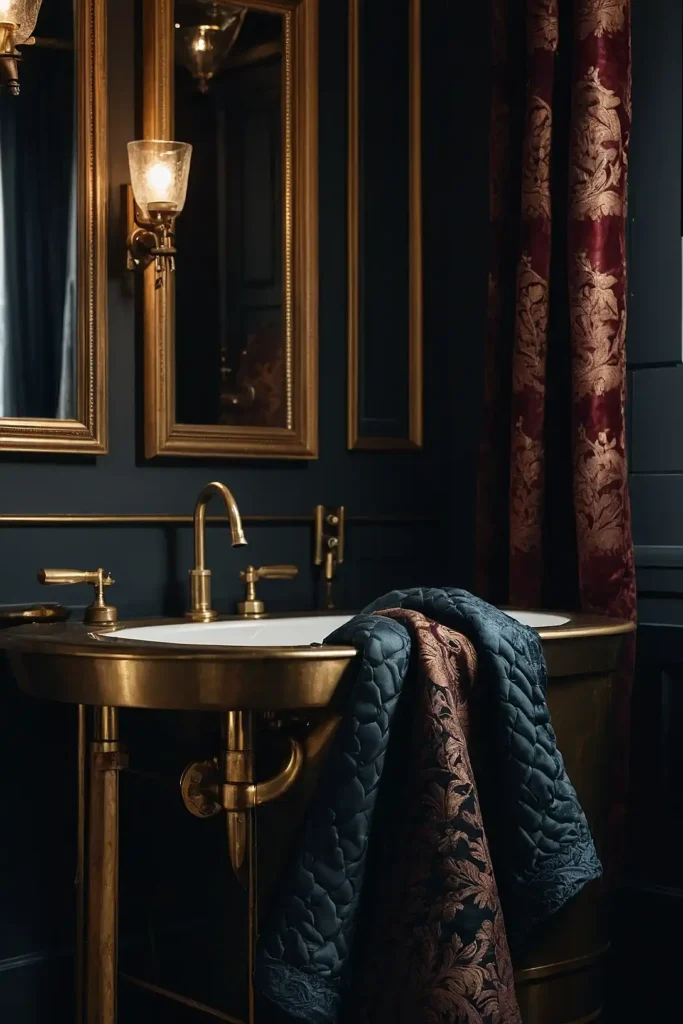 You can mix textures like velvet, linen, and lace. Vintage textiles bring warmth while creating sophisticated contrast against hard bathroom surfaces and fixtures.