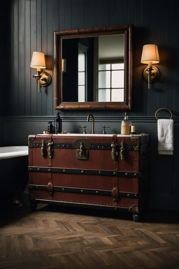 Repurpose antique trunks or steamer chests for bathroom storage and seating.