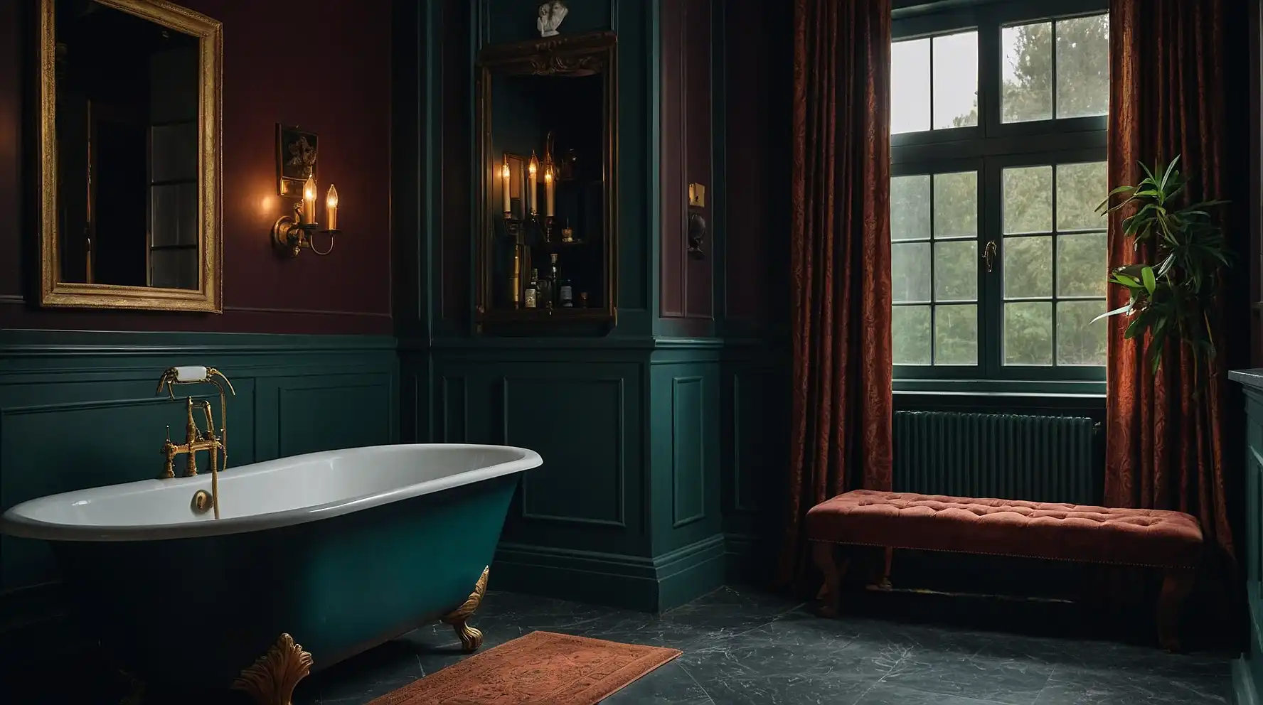 Your bathroom achieves sophisticated drama through bold color choices that enhance vintage elements.