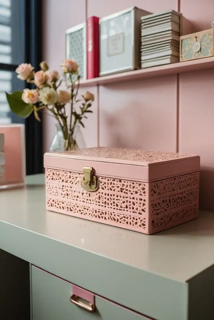 Choose boxes with floral prints, pastel colors, or metallic accents that coordinate with other accessories. Various sizes accommodate different storage needs efficiently.