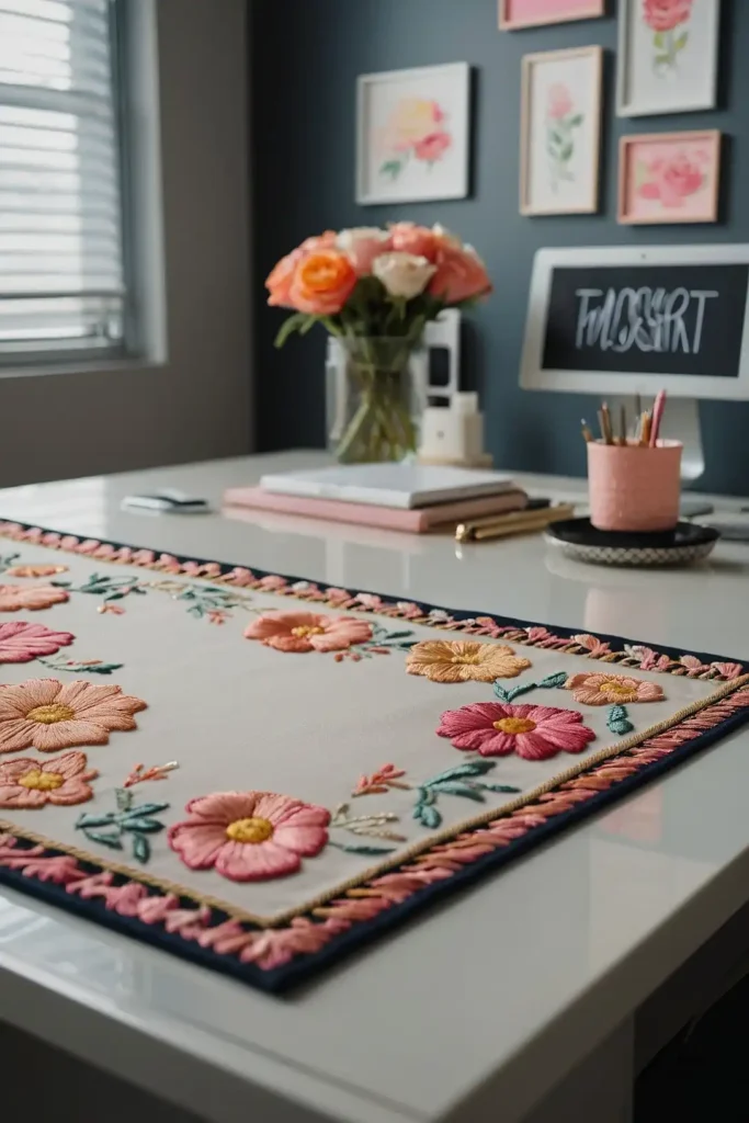 You add softness and pattern with embroidered table runners that protect surfaces while contributing textile beauty to hard office environments.