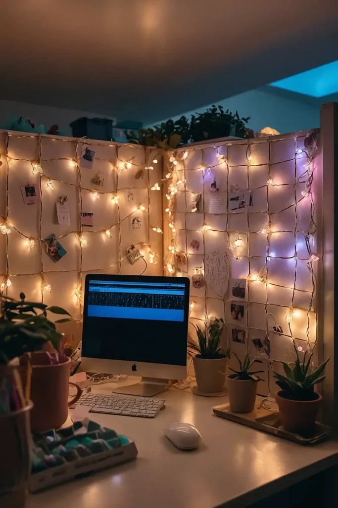Fairy lights create magical ambiance that transforms sterile cubicles into enchanting workspaces.