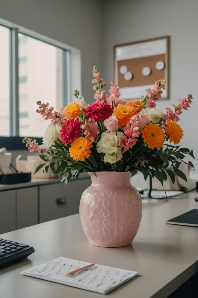 Pink roses, white daisies, and purple lavender work particularly well in office environments.
