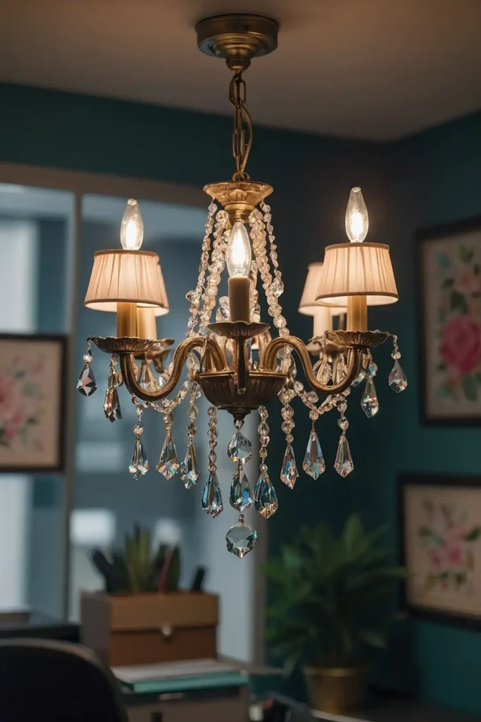 A small decorative chandelier adds glamorous lighting while creating focal points that elevate your entire workspace atmosphere.
