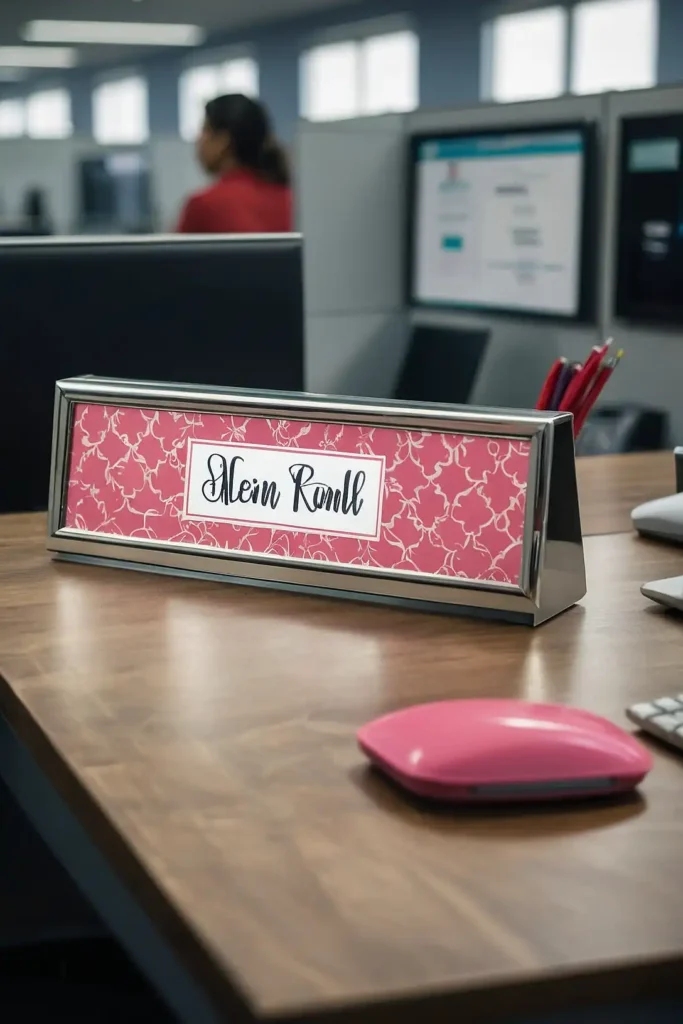 A personalized nameplate featuring beautiful fonts and decorative elements announces your presence while adding professional femininity.