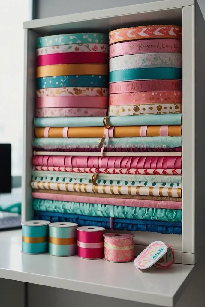 You create functional beauty with ribbon organizers that keep supplies sorted while adding texture and color throughout your space.