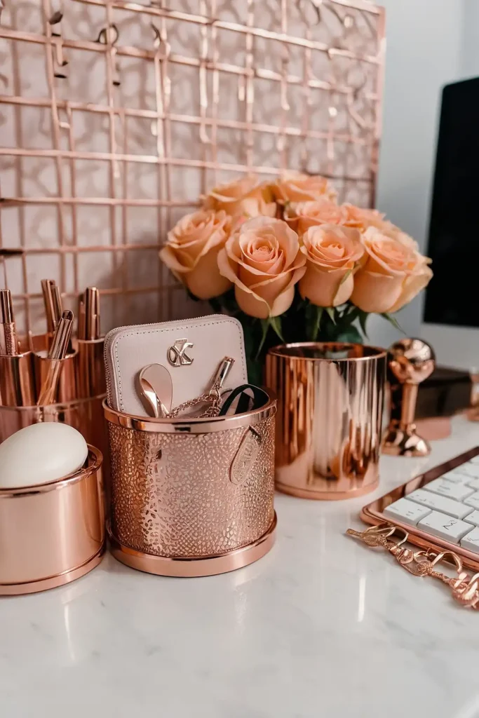 Rose gold accessories add sophisticated glamour while maintaining feminine appeal throughout your workspace.